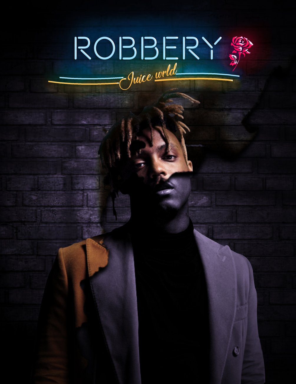 Do you like the song Robbery by Juice WRLD? Would you like to express your gratitude for his music and his legacy? If so, you're going to adore this digital artwork I made. The image features the late rapper Juice WRLD and his song Robbery in a dramatic, dark setting with neon lights and a rose. It pays homage to his brilliance and untimely demise. This digital artwork can be printed and used as a poster or as a background on your computer or phone. It's a special and creative way to show your admiration for Juice WRLD and Robbery. Seize the chance to own this great digital artwork for